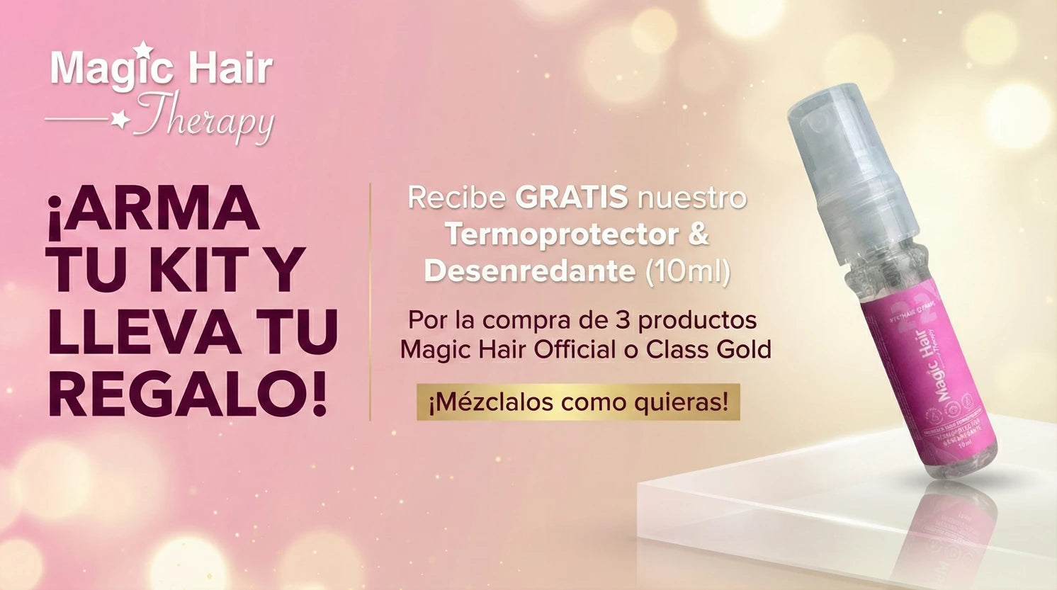 Transformar tu cabello y recibir regalos nunca fue tan fácil. Para llevarte nuestro obsequio exclusivo, solo tienes que elegir 3 productos individuales de Magic Hair Oficial o Class Gold. ¡Eres libre de armar tu carrito como prefieras! Combínalos a tu gusto, o si quieres simplificar tu rutina, elige cualquiera de nuestros kits que incluya un mínimo de 3 productos de estas marcas. Al cumplir esta condición, tu regalo se añadirá automáticamente.