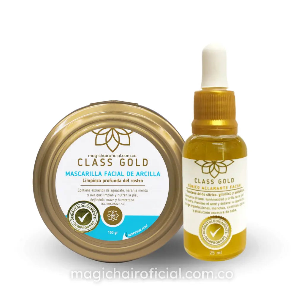 - El kit completo proporciona resultados visibles en tiempo récord, haciendo que la mascarilla Class Gold y el limpiador con ácido salicílico sean imprescindibles en tu rutina facial.